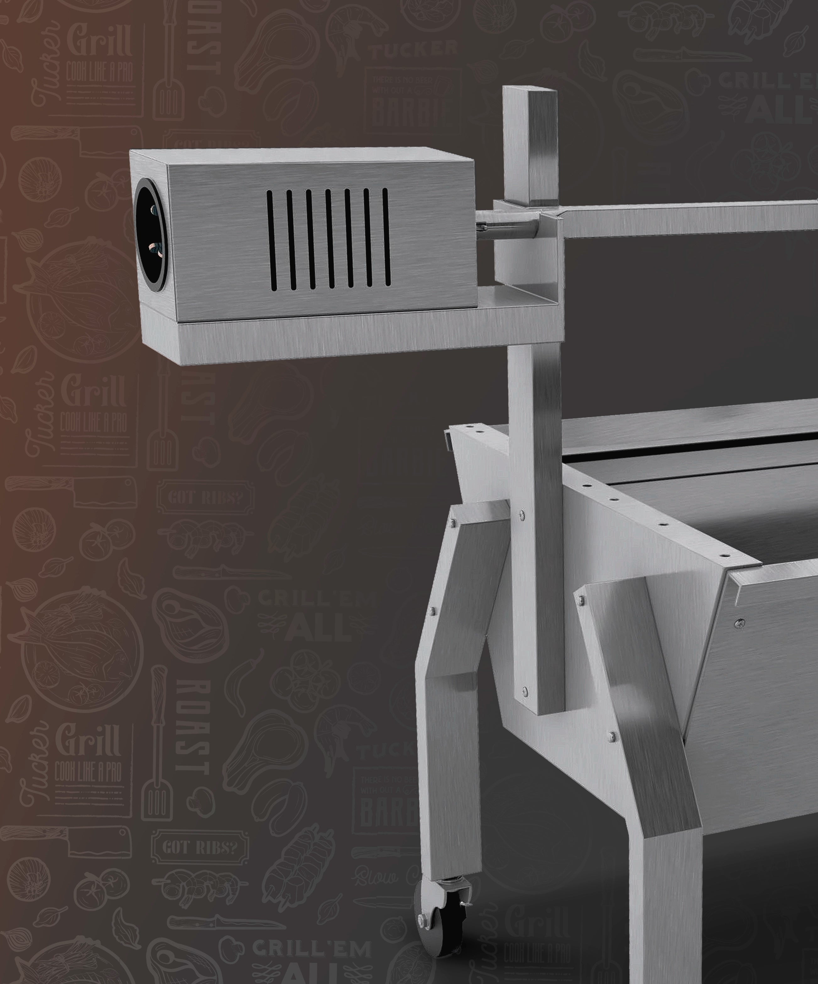 Stainless steel lockable castors. Adjustable height stainless steel skewer rod shaft as the coals burn. Powerful 3 rpm electric motors for up to 40kg of weight with auto reverse if the motor gets jammed. Solid 304 grade stainless steel prong, mid brace, and leg brace.